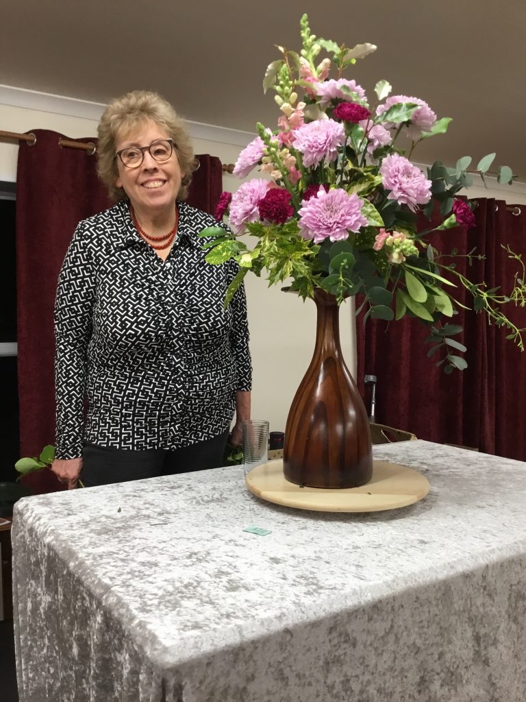 The demonstrator for the evening was the very capable Louise Littlejohn, whose theme was “Shape Shifting Nature”. Despite a sore back, Louise gave us a splendid display of arrangements and also encouraged a bit of audience participation which was very well received. Many thanks to Louise, who can be seen with one of her arrangements below.